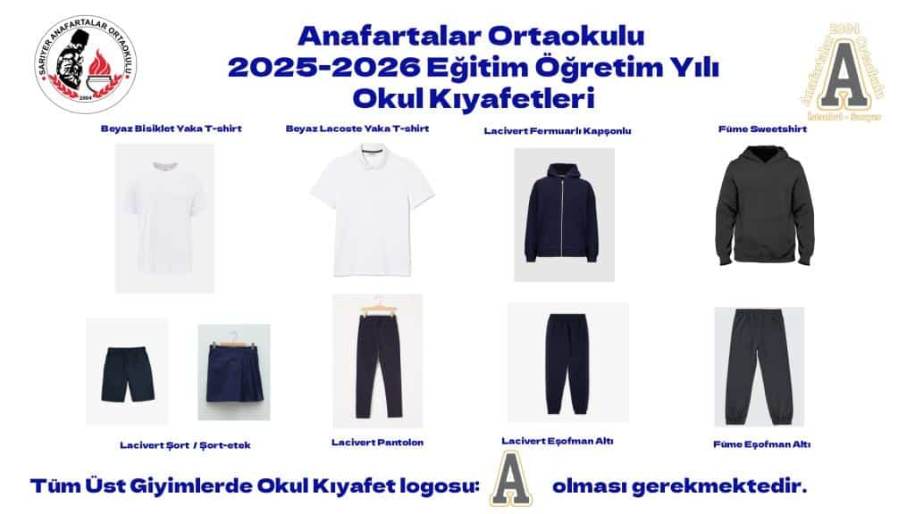 Değerli velilerimiz sevgili öğrenciler; 2025-2026 Eğitim öğretim yılından itibaren okulumuzda okul kıyafeti uygulamasına geçilecektir. Tüm ortaokul sınıflarının aşağıda ayrıntıları verilen okul kıyafetlerinden temin ederek eğitim öğretim yılına okul kıyafeti ile başlamalarını önemle rica ederiz.